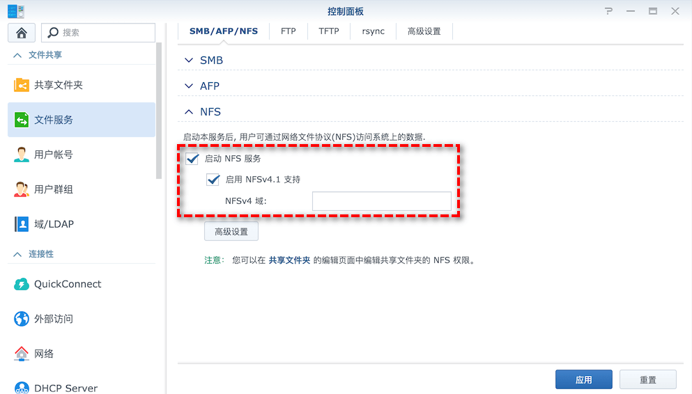 步骤1. 访问Synology NAS,然后单击“控制面板”>“文件服务”,勾选“启动NFS服务”选项,然后单击“应用”。