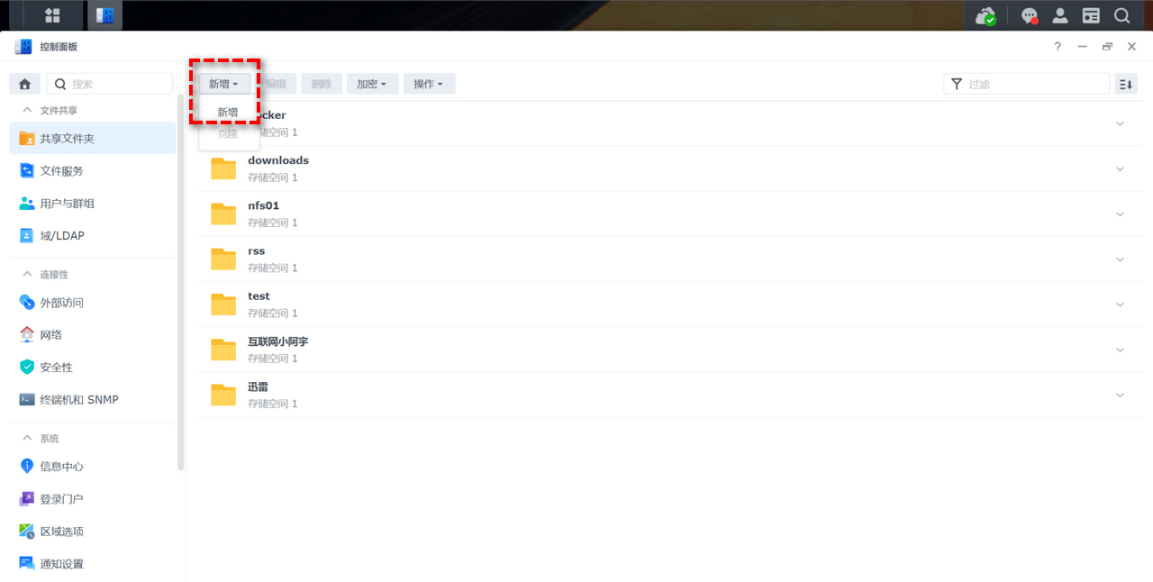 步骤2. 返回控制面板,单击“共享文件夹”>“新增”以打开共享文件夹创建向导。