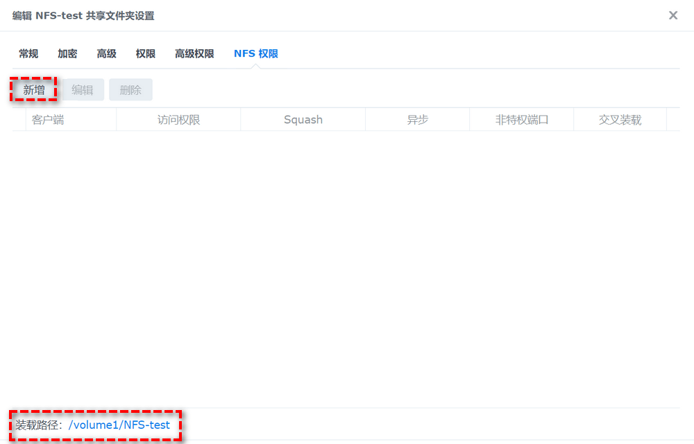 步骤4. 返回共享文件夹选项卡,然后点击“编辑”,然后在弹出窗口中点击“NFS权限”>“新增”。