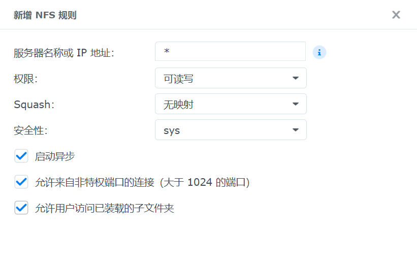 步骤5. 填入服务名称或ESXi主机的IP地址(静态),选择读写权限等其他配置,然后单击“确定”以添加此NFS规则。