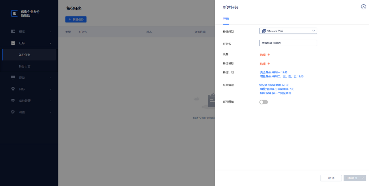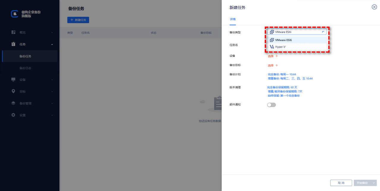 步骤3. 根据您的需求设置备份类型、任务名、设备、备份目标、备份计划、版本清理等。