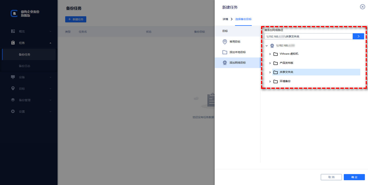 🔎 备份目标:选择“添加网络路径”以将备份存储在网络位置,从而节省本地磁盘空间,然后点击“确定”。
