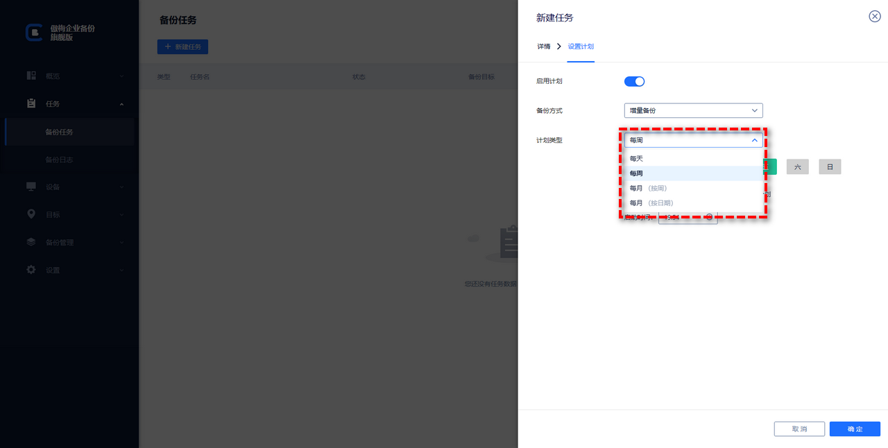 🔎 备份计划:选择您想要的备份方式和自动备份间隔,设置完毕后点击“确定”。