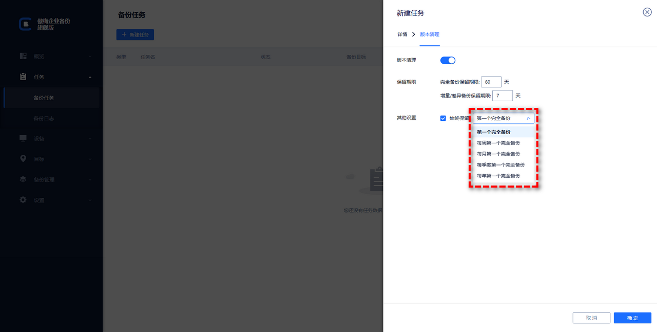 🔎 版本清理:配置您的保留策略以自动删除旧备份文件,节省存储磁盘空间,设置完毕后点击“确定”。