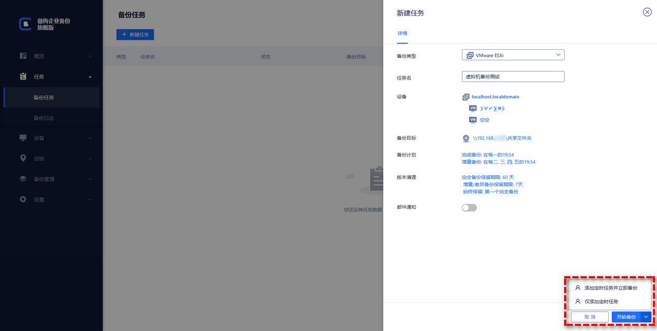 步骤4. 点击右下角的“开始备份”按钮,然后选择“添加定时任务并立即备份”或“仅添加定时任务”。