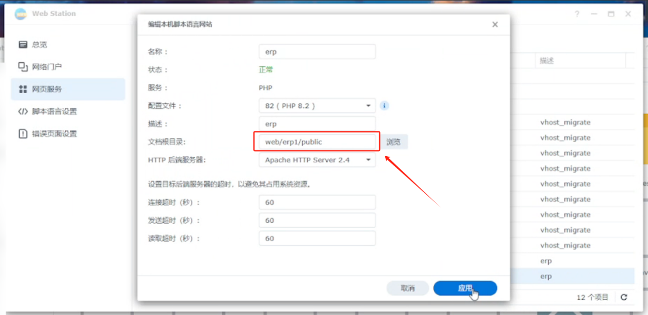 打开文件中心,找到刚才选择的web下的根目录,将下载的软件完整包拖入根目录并解压,然后回到我网页服务中,选择刚才新增的网页服务,将文档根目录修改为刚才解压出的文件中的public,然后点击底部应用;