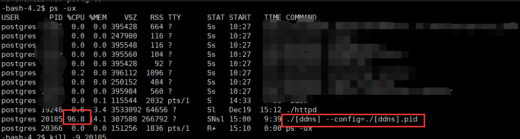 切换postgres用户ps -ux查看该命令 ./[ddns] –config=./[ddns].pid