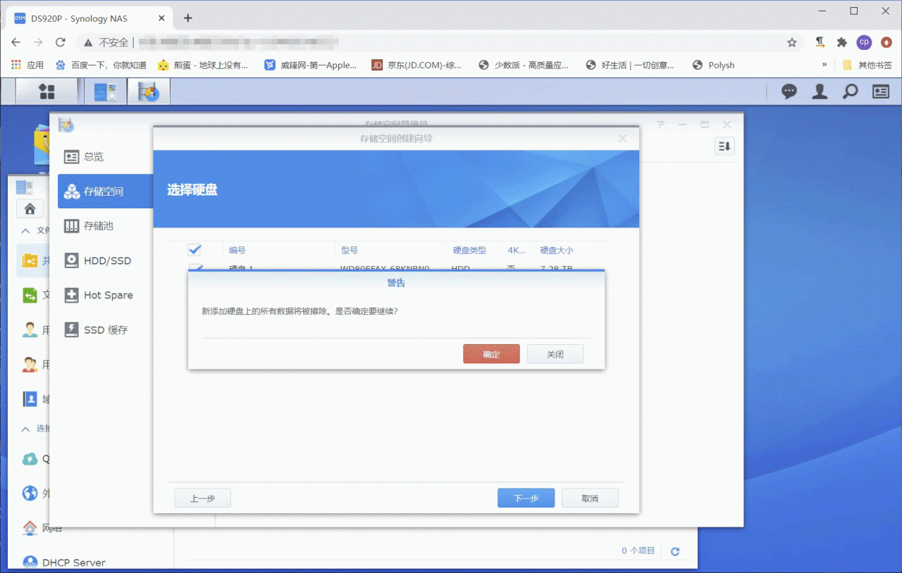设置OK后,选择硬盘,格式化所有数据,并且选择Btrfs文件系统,群晖的初级配置就完结了。