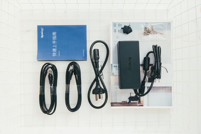 附件方面双千兆网线,电源适配器、硬盘仓锁钥匙、两本快速上手指南。