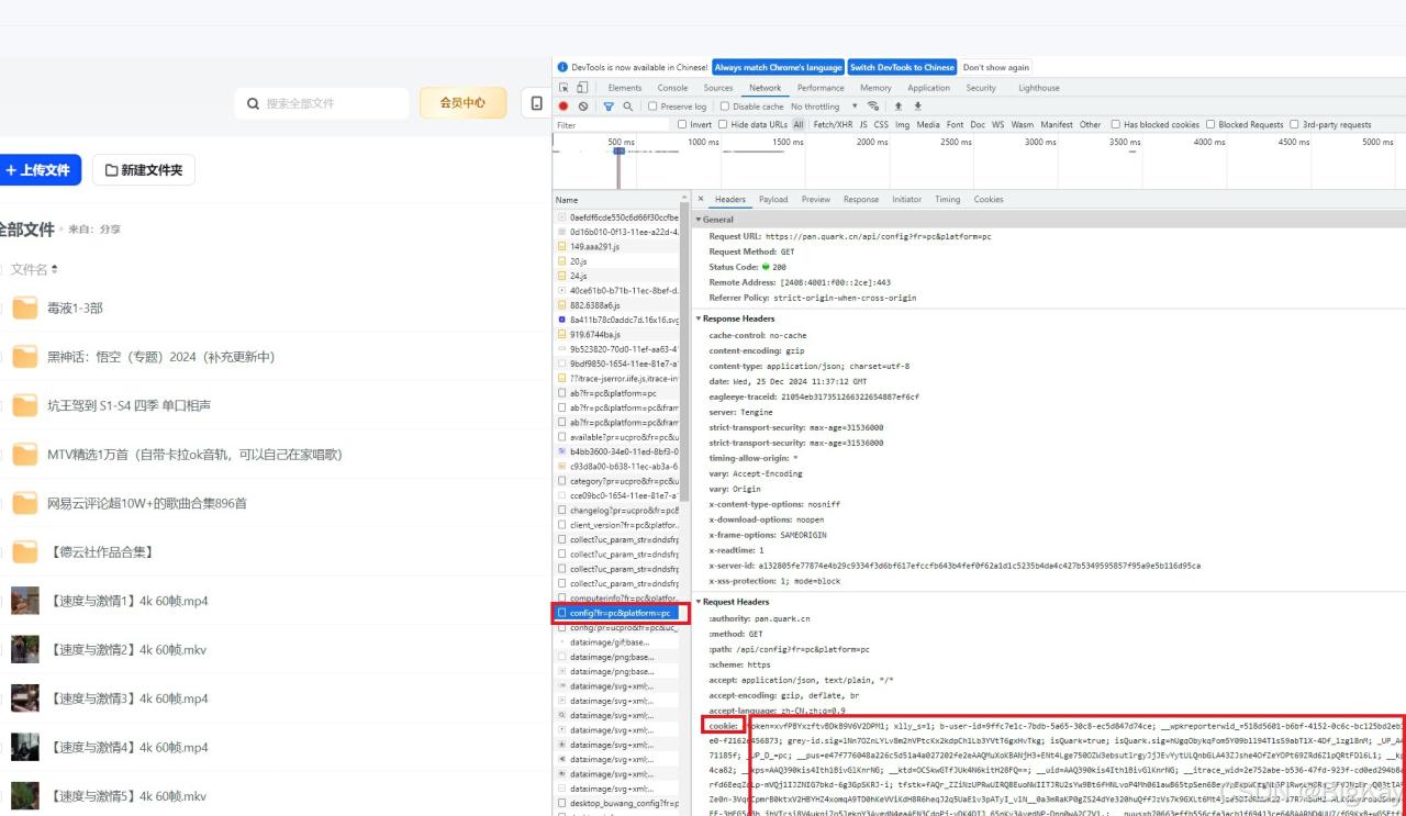 获取cookies方法:打开pan.quark.cn,F12打开开发者工具后的Network(网络)找到某个含有cookies的页面,拷贝全部内容,粘贴到Cookies里;