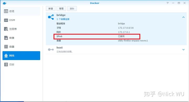 但是首先就遇到了第一个问题,如果需要utorrent做种的话,就需要在docker内安装utorrent客户端,但是群晖的docker套件默认是不支持ipv6的,可以在docker的网络选项卡内看到,bridge桥接的ipv6默认是禁用的。