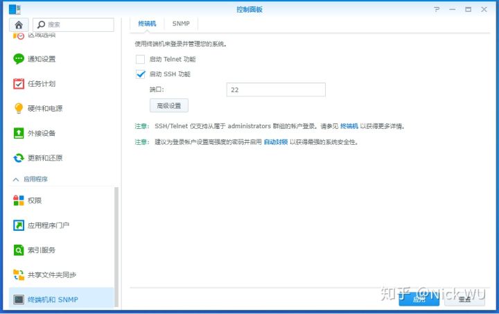 控制面板-终端机和 SNMP-启动SSH功能,端口可以自由设置。