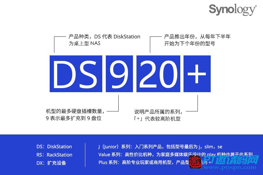 相信很多人一开始都对群晖型号命名有个疑问,为什么DS920+(DS918+升级款)明明是4盘位,却是9开头呢?像220+,220J这些是2盘位的就很好理解。看了上图大家应该就明白了,这个9代表的是这款机器最大可扩展到9盘位。因为920+支持群晖DX517这个扩展设备,这个扩展设备是5盘位的,加上920+机器自身的4盘位,一共就是9盘位了。类似的型号还有720+(原生2盘位,扩展7盘位)、1618+(原生6盘位,扩展16盘位)、1819+(原生8盘位,扩展18盘位)、1019+(原生5盘位,扩展10盘位)等。