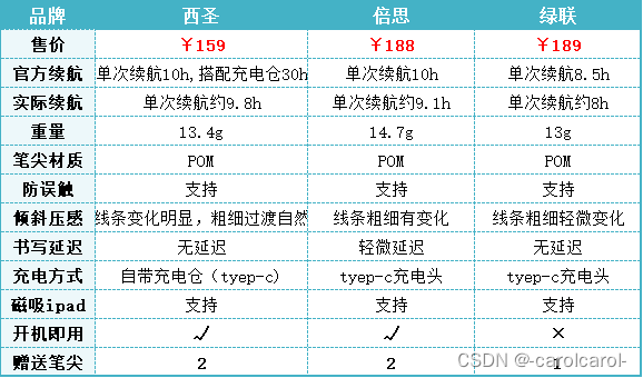 为了让大家更加直观、快速的看到这三款电容笔的对比,我先将产品配置的一览图放在前面,以供参考。