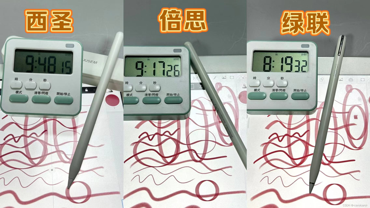 电容笔的续航时间指的是单次充电后能够持续使用的时间长度,一个良好的续航时间意味着用户可以在不频繁充电的情况下长时间使用电容笔,提高了用户的工作效率和体验感。续航时间的长短受多种因素影响,包括电池容量、使用场景、笔的功耗管理等,下面我将这三款电容笔都充满电,然后连续使用,直至没电,以此测出它们的实际续航时间。