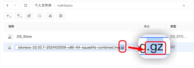 下载好的镜像需要通过重命名的方式,删除【.gz】文件后缀名。