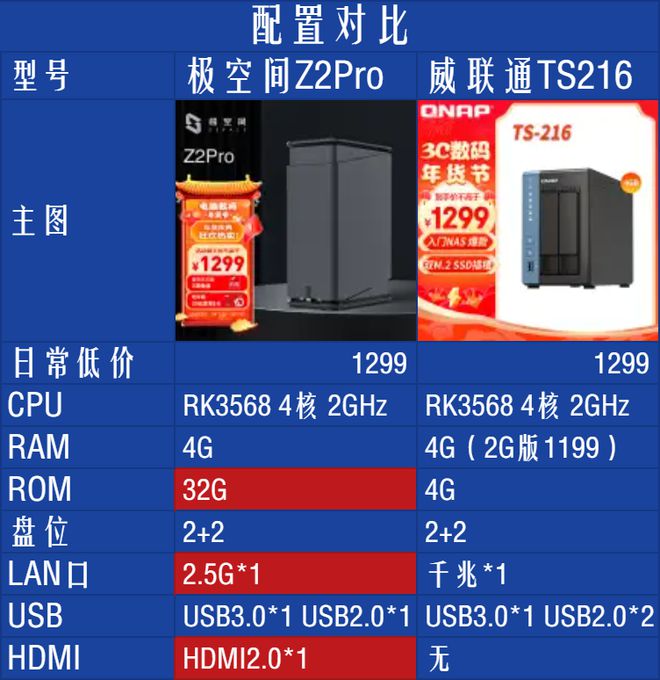 以威联通的TS216和极空间的Z2PRO为例,它们的日常低价都是1399元上下,但硬件差距基本上可以说是一目了然▼