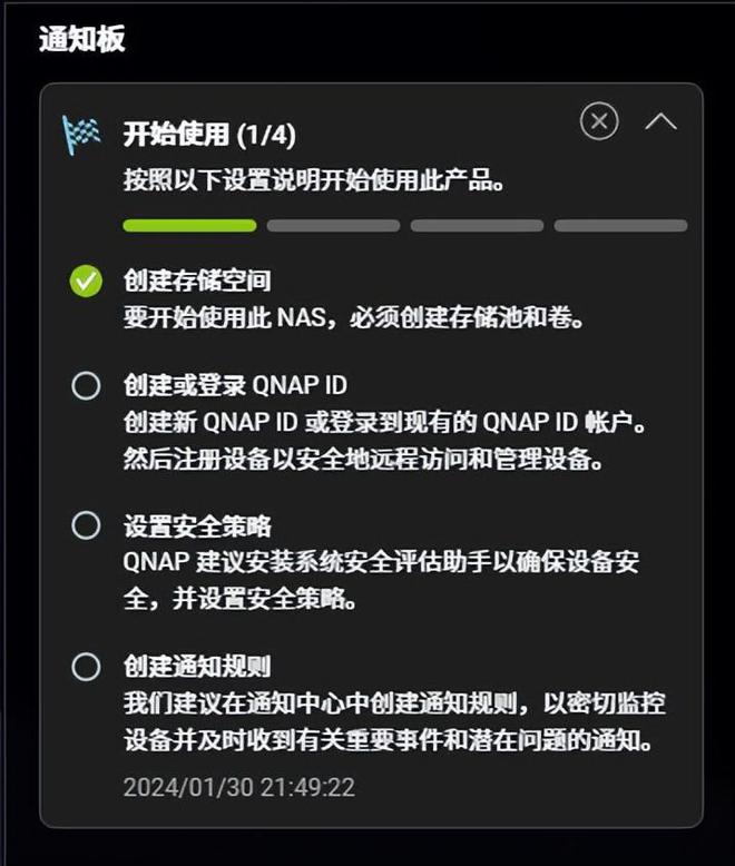 先别激动,因为你这只是“开机”了,此时才进入了更详细的设置,包括账号注册,存储池设置,卷类型选择设置,等等▽