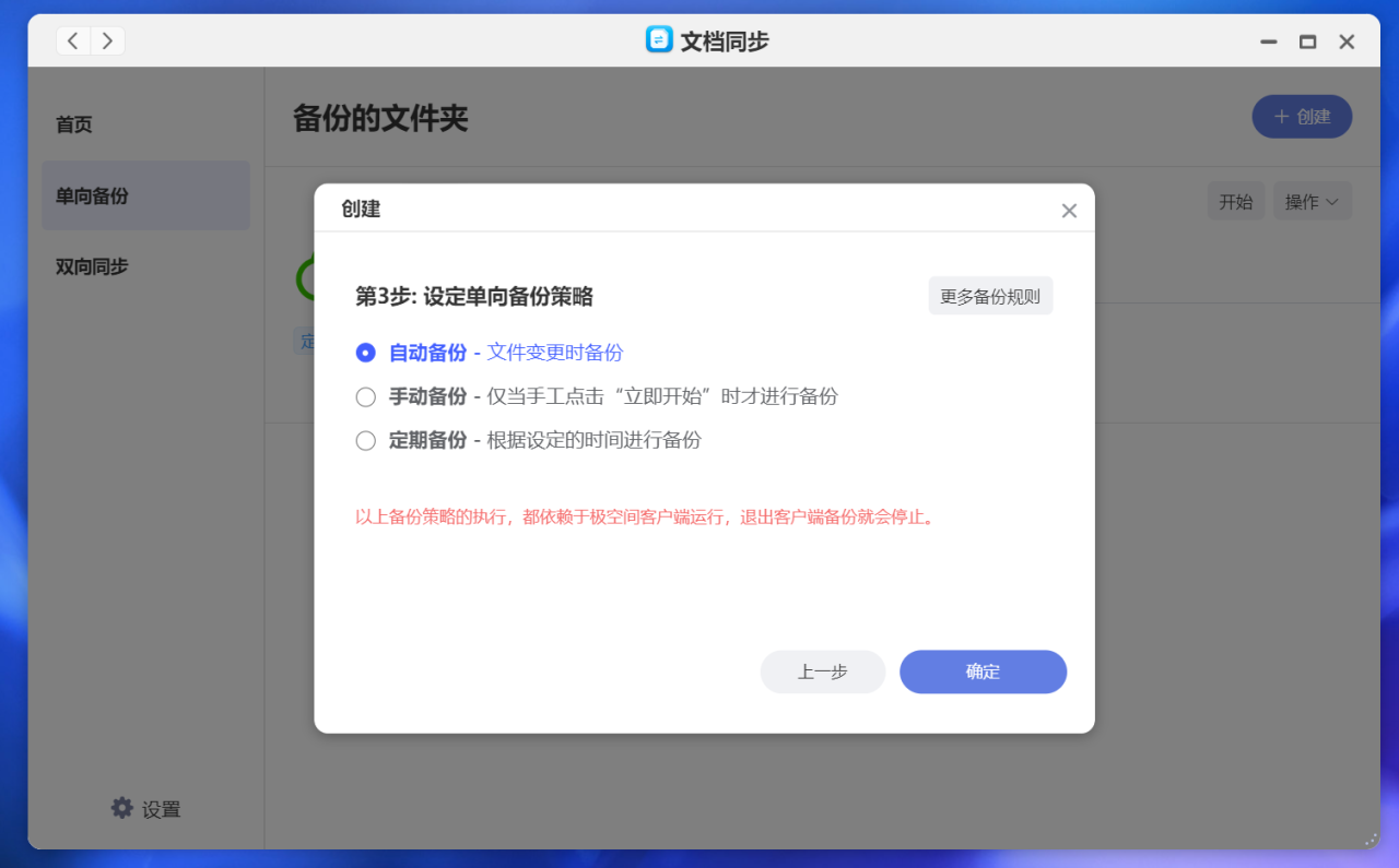🔺然后是备份策略,极空间文档同步的备份策略还是挺灵活的,除了常规的自动备份和手动备份,还支持自定义的定期备份。