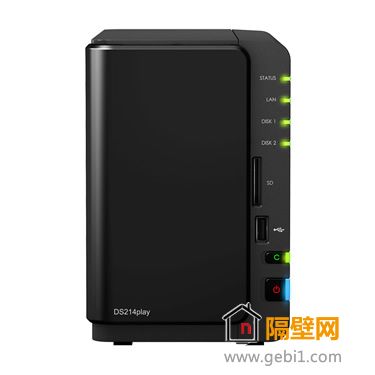 这个是一台群晖的DS214play型号的NAS,机器很小,相当于家里的一个低音炮那么大;可以插2个硬盘,前面板有sd卡插槽,开机键,一键拷贝(意思就是按一下你sd卡的数据就可以拷贝到机器里面了),后面有usb3.0接口、esata接口、网口。