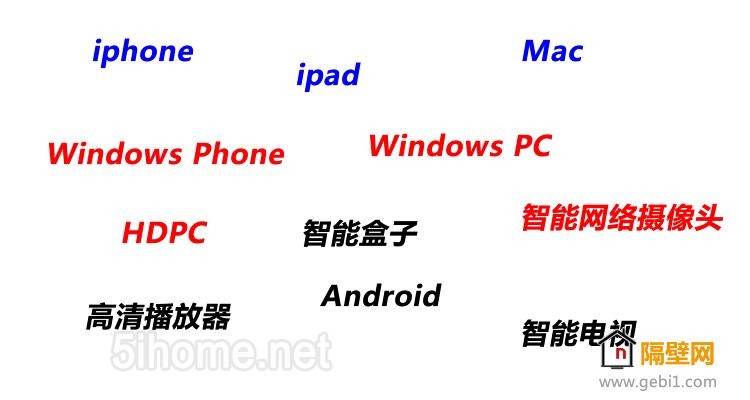 安卓手机、苹果手机、WP手机、windows电脑、苹果电脑、平板、智能电视、智能摄像头、高清播放器、下载机等等