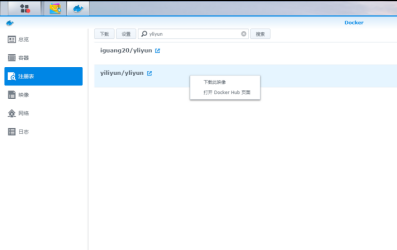 2. 打开Docker套件,点击注册表模块搜索yliyun镜像。