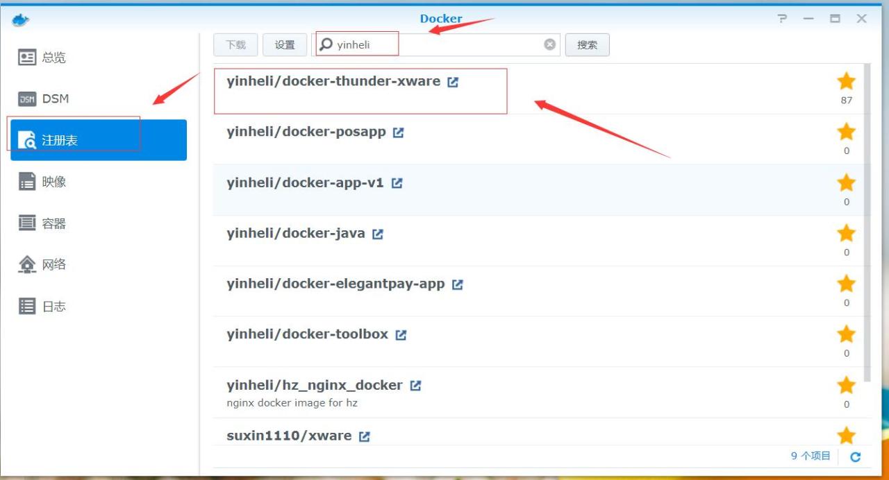1.启动docker,切换到注册表选项卡,搜索yinheli