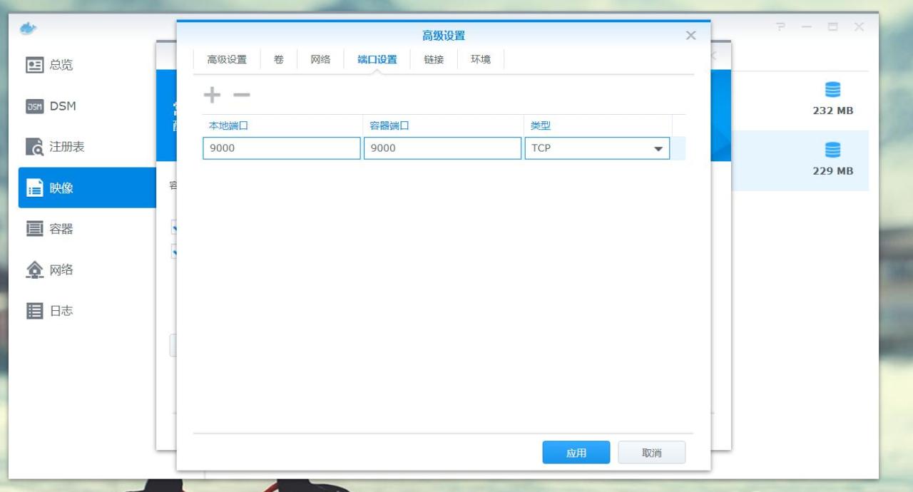 点端口设置下面的+,增加端口映射,随便找个本地没被用过的端口(比如9999),容器端口设置为9000,类型默认TCP,