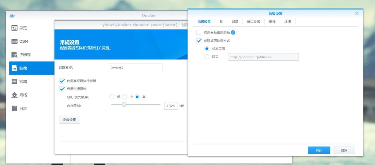 2.选项卡“映像”中,选中 yinheili/docker-thunder-xware,点击“启动”,出现启动向导设置界面,容器名随便取。