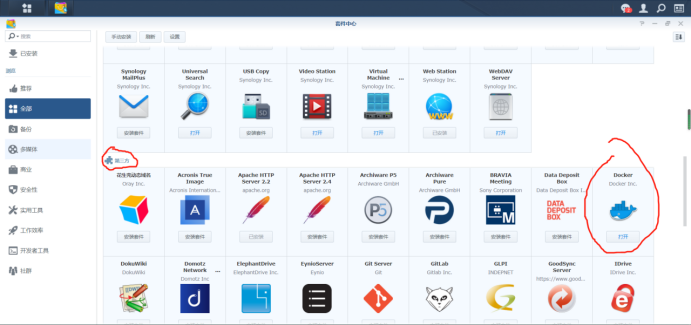 2、在群晖中安装docker环境,进入套件中心,选择docker下载安装(如果没有,添加第三方套件中心)