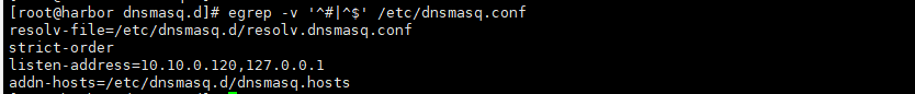 cp /etc/dnsmasq.conf /etc/dnsmasq.conf.bak echo 'resolv-file=/etc/dnsmasq.d/resolv.dnsmasq.conf' >> /etc/dnsmasq.conf #表示dnsmasq 会从这个指定的文件中寻找上游dns服务器 echo 'addn-hosts=/etc/dnsmasq.d/dnsmasq.hosts' >> /etc/dnsmasq.conf #添加读取额外的 hosts 文件路径,可以多次指定;也可以指定为目录,会自动扫描此目录下的配置文件 cat /etc/dnsmasq.conf ... strict-order #取消这一行的注释,表示严格按照resolv.conf中的顺序进行查找 listen-address=127.0.0.1,192.168.115.120 #多个ip地址设置;如果想允许所有的用户使用你的DNS解析服务器,把listen-address去掉即可 ...