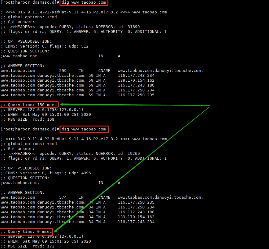第一次查询耗时150ms,第二次查询耗时0ms