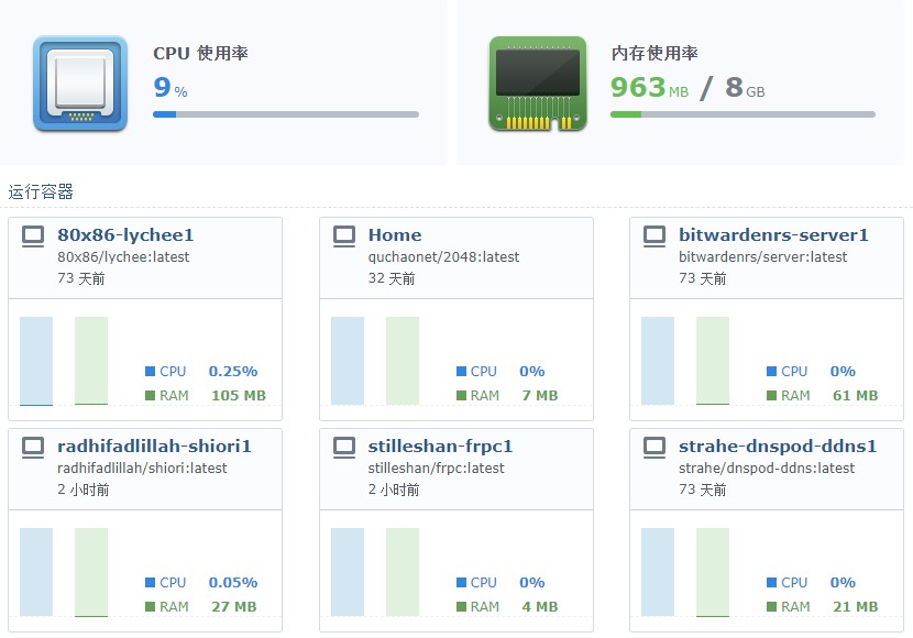 首先要在群晖上安装Docker套件,我的Docker应用主要有,lychee、Shiori、ddns、frp、transmission、qbittorrent、Selfoss、Bitwarden、Heimdall、Navidrome、Mango等,主要是一些下载工具和相册、书签管理器、外网连接工具、RSS阅读器、导航页、音乐播放器、漫画阅读器等。
