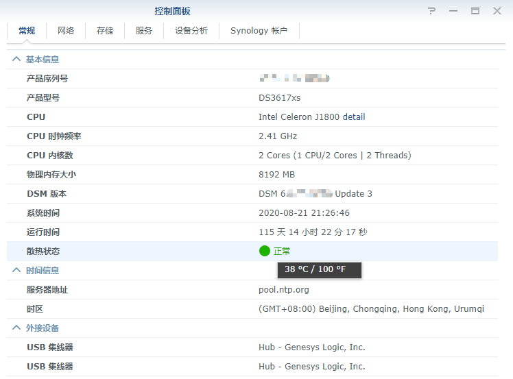 目前有两台机子运行着群晖的系统,其中一台是安装在蜗牛星际D款上,只用来是同步手机的照片和存储一些资料,多数时间是关机的状态,而另一台是运行在一块J1800工控板上,这块板子我之前是安装Ubuntu Server 18.04,虽然架子外面是有防尘网的,可是一直开机了100多天,灰尘还是太多了,其实运行时间远不止这个数,中间因为风扇异响关过一次机,总体来说稳如狗,功耗还低。