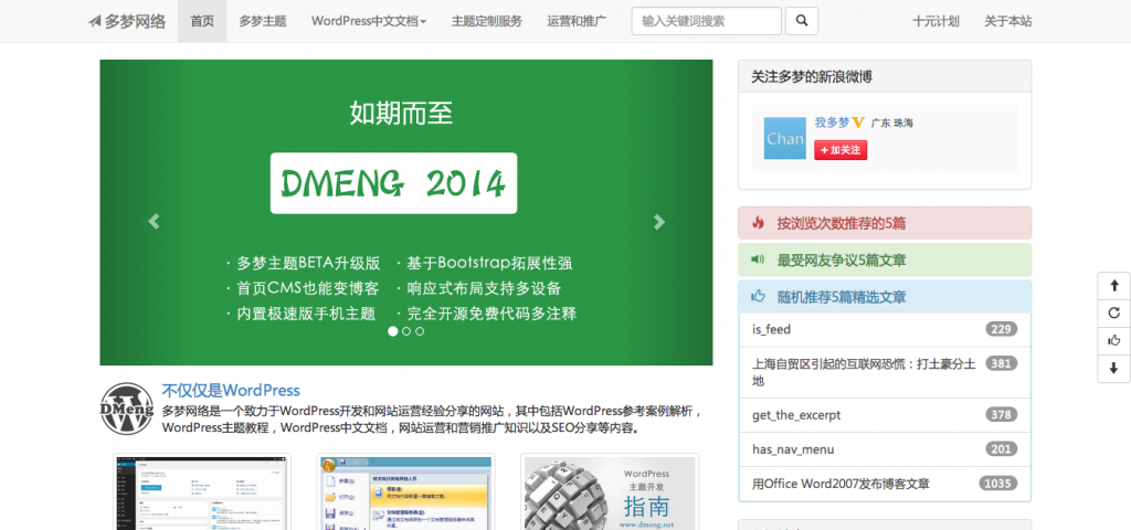 多梦主题2014是一款基于Bootstrap V3的WordPress主题,主题是响应式设计,支持PC、平板电脑和手机多设备访问,还设有极速版手机主题,大大提高了用户通过手机访问的速度及用户体验。