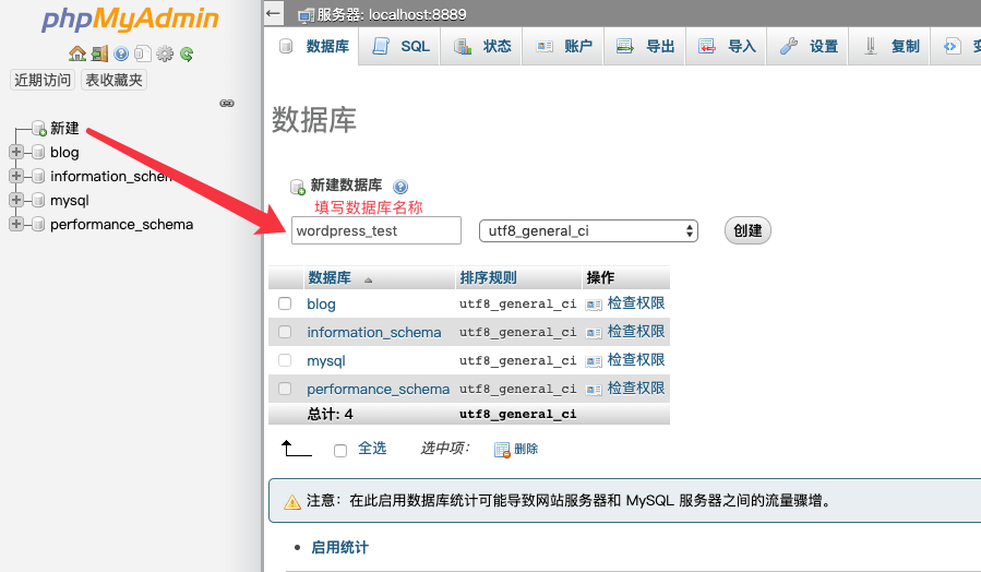1、访问http://localhost:8888/phpMyAdmin新建一个数据库,步骤如下: