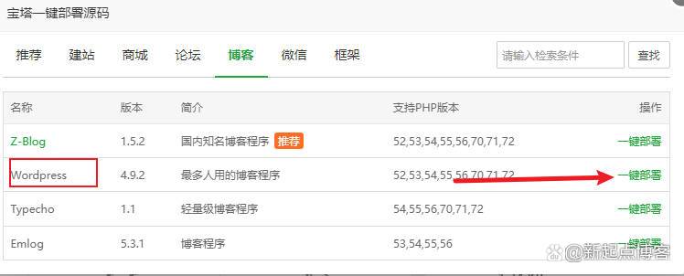 3.我们点击此插件会看到里面会有很多的程序,我们选择WordPress,然后点击一键部署。将域名绑定到这里(注:数据库这里一定要注意,需要后期和网站数据绑定的)