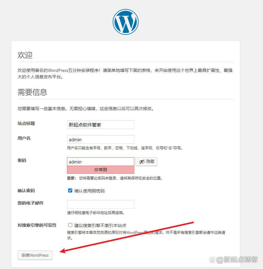 4.下一步会提示让我们简单的填写一个信息。根据自己的需求我们自行填写即可。填完以后点击菜单“安装WordPress”按钮如图所示: