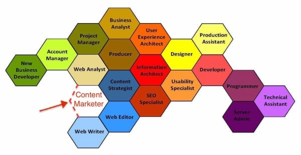 当然,内容营销人员也与其他角色一起工作,而不仅仅是这个二维表示中的相邻六边形。