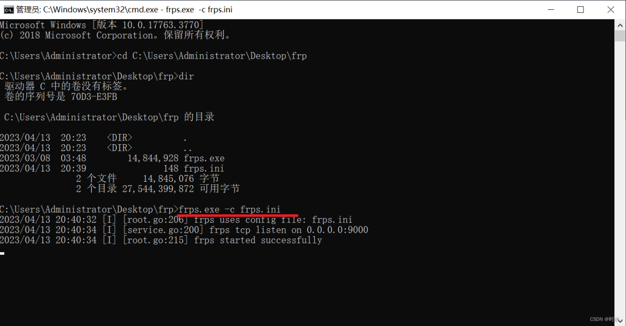 此过程中使用到的文件为:frps.exe 和 frps.ini(两个文件建议放到同一个目录下)