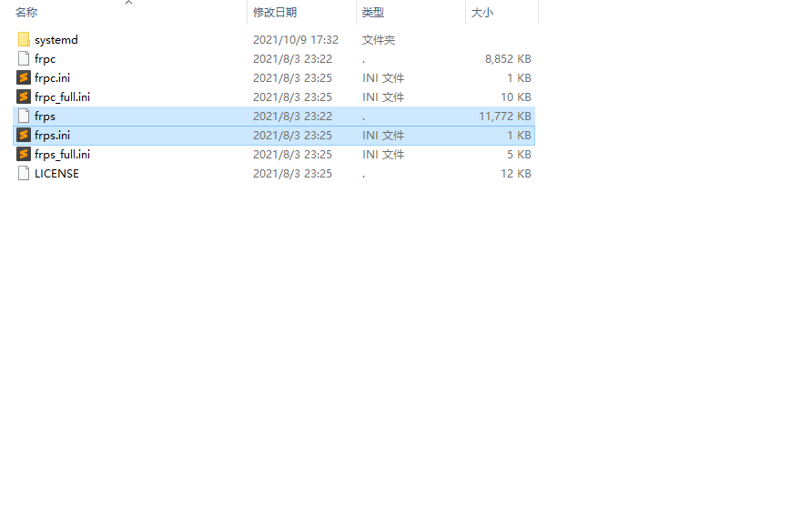 2.服务器部署,下载下来linux版本的frp,解压后有“frpc、frpc.ini、frps、frps.ini”等文件,如下图。