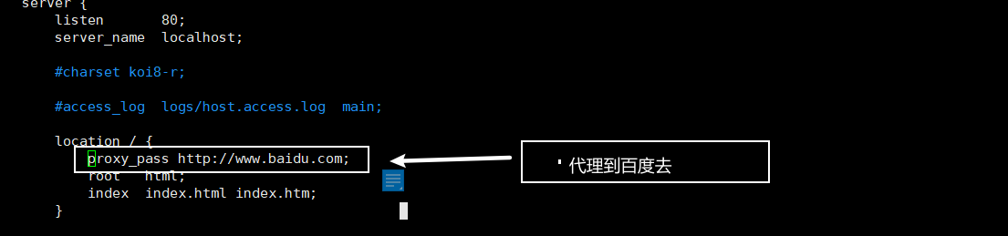 我们编辑这个配置文件在这里设置反向代理,在该位置添加(proxy_pass http://www.baidu.com;),用百度来测试。