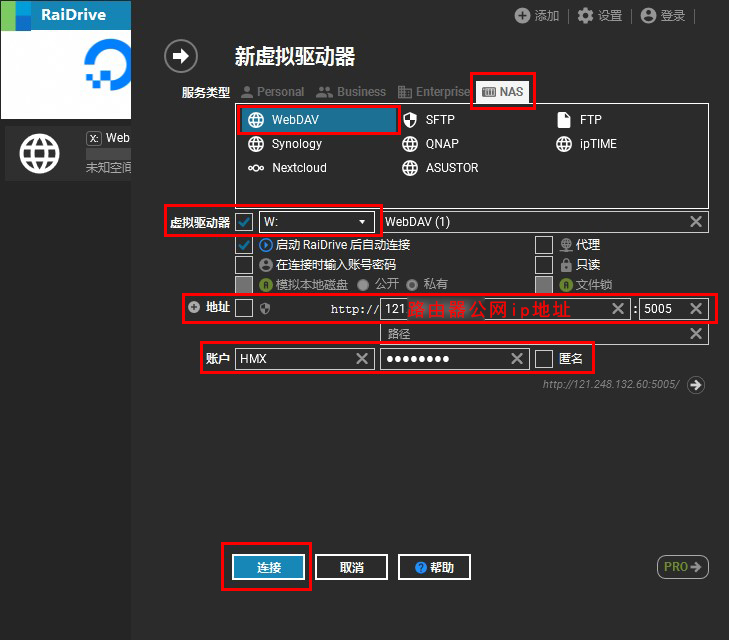 不在局域网络的时候,上述方法就不行了,这里我们需要借助软件Rai Drive(免费版的就够用了)进行外网的磁盘映射。当然除了软件外,还有三个先决条件:1.需要有公网ip,2.群晖NAS需要开启WebDAV Server。3.路由器端口转发。