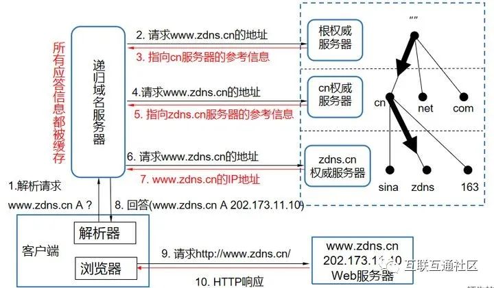 5、这里补充说明,一旦递归服务器拿到解析记录以后,就会在本地进行缓存,如果下次客户端再请求本地的递归域名服务器相同域名的时候,就不会再这样一层一层查了,因为本地服务器里面已经有缓存了,这个时候就直接把zdns.cn的A记录返回给客户端就可以了。