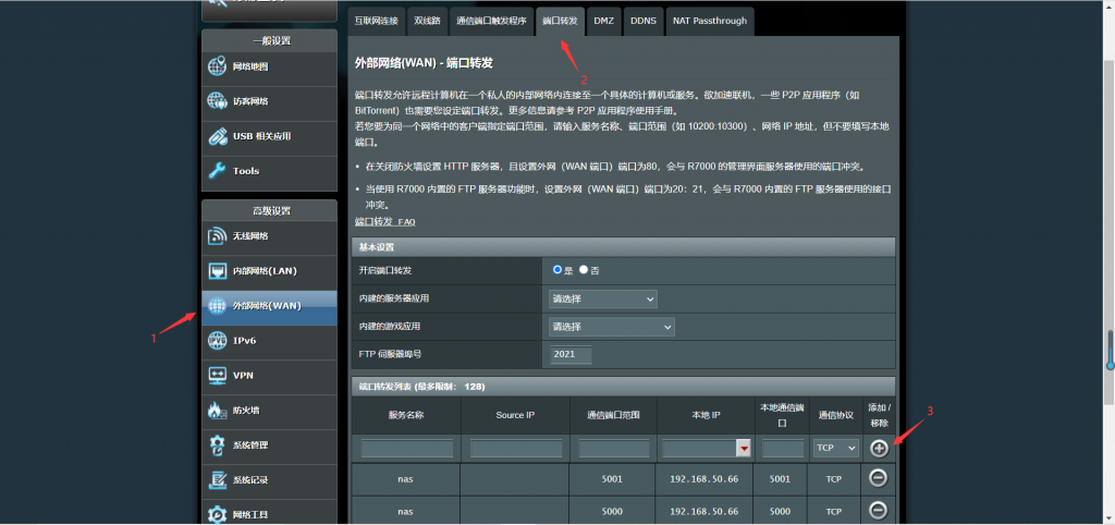 登录到路由器设置,找到“外部网络WAN”(部分被称为“端口映射”)的“端口转发”,按照下图配置端口转发,点击“保存应用程序设置“并退出: