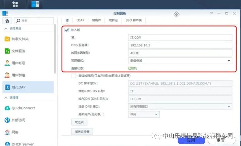·将NAS加入域,所有套件和文件可通过域用户来访问。