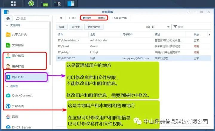 ·Synology Directory Server是将NAS作为域控服务器,用户是NAS的本机用户。别的服务器需要加入NAS的域控,进行用户认证。
