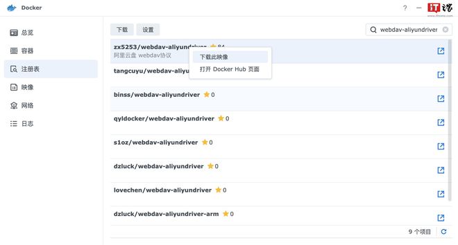 打开 Docker 套件,选择注册表,在右上角的搜索框中输入 webdav-aliyundriver 或者 aliyundrive-webdav,在搜索结果中选择对应的镜像进行下载。