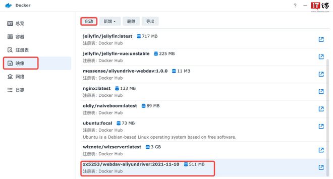 打开 Docker 套件,选择映像,并选择对应的镜像,点击上方启动按钮。