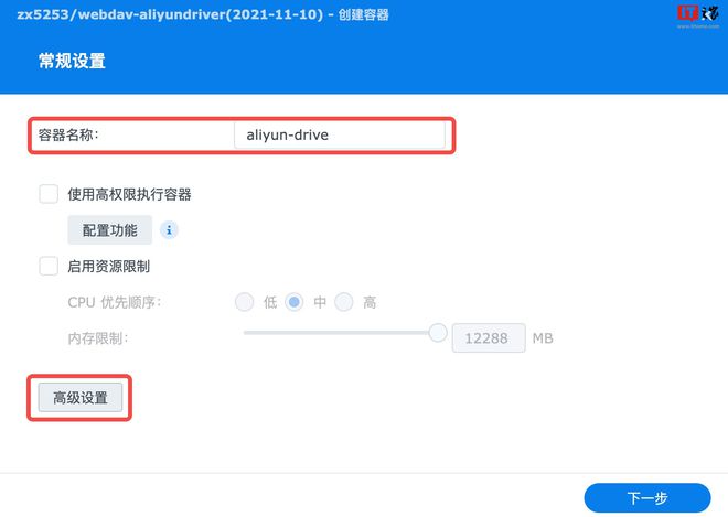 根据自己的需要设置容器的名称,并且点击下方的高级设置。